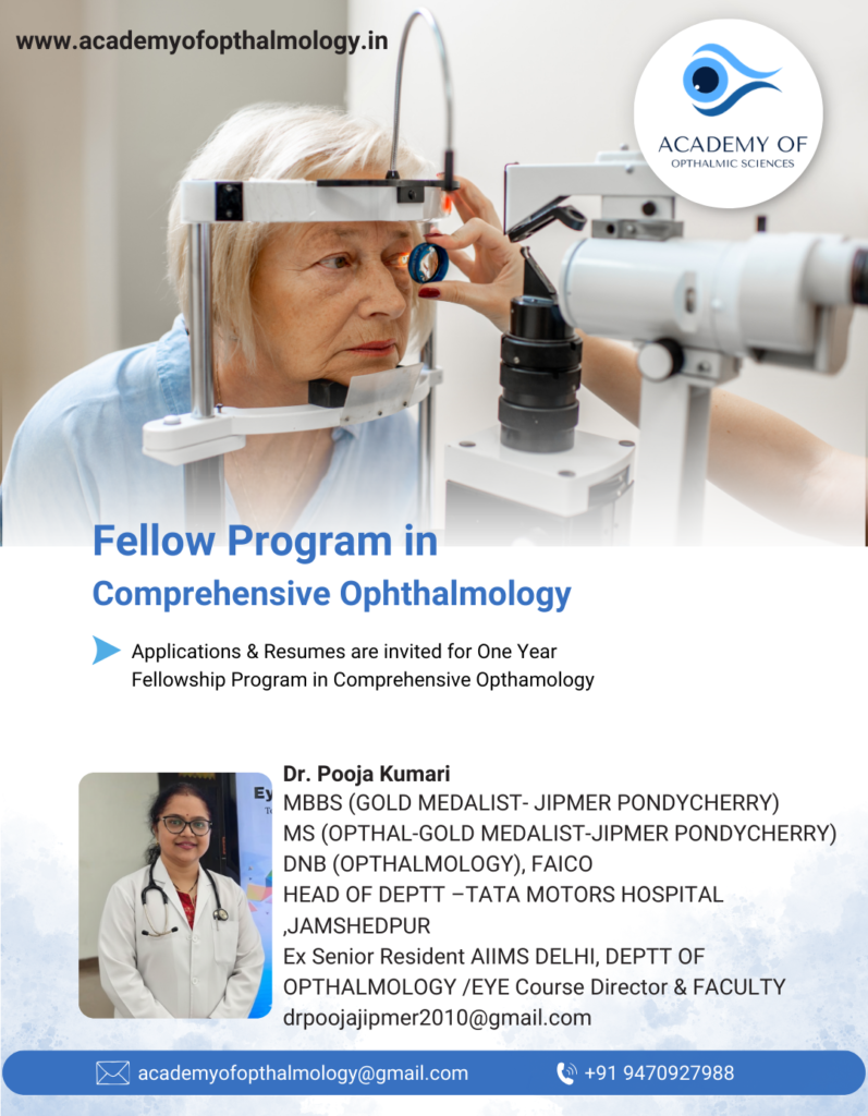 MBBS (GOLD MEDALIST- JIPMER PONDYCHERRY) MS (OPTHAL-GOLD MEDALIST-JIPMER PONDYCHERRY) DNB (OPTHALMOLOGY), FAICO HEAD OF DEPTT –TATA MOTORS HOSPITAL ,JAMSHEDPUR Ex Senior Resident AIIMS DELHI, DEPTT OF OPTHALMOLOGY /EYE Course Director & FACULTY drpoojajipmer2010@gmail.com